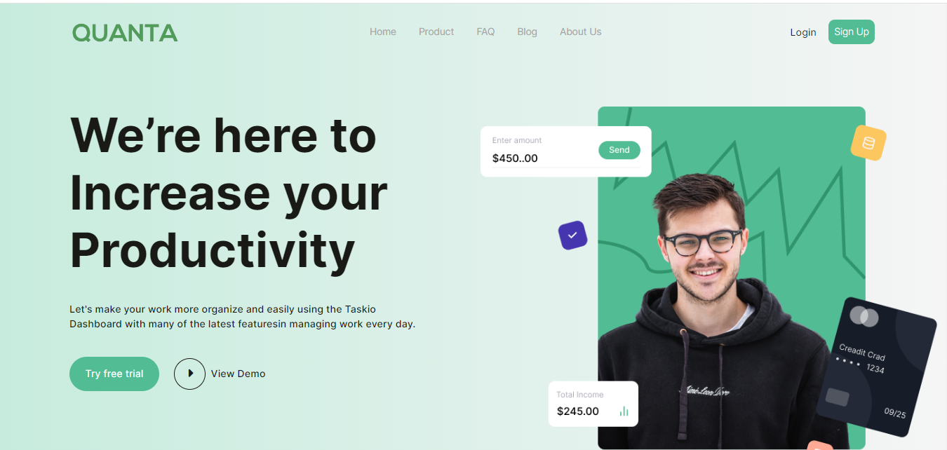 Quanta is dedicated to boosting your productivity by helping you organize and streamline your work effortlessly. With the Taskio Dashboard, you can manage your daily tasks using the latest features designed to enhance efficiency. We offer a variety of innovative tools that empower you to increase productivity, manage projects easily, and keep your work organized. Let Quanta transform your workflow and help you achieve your goals with ease.